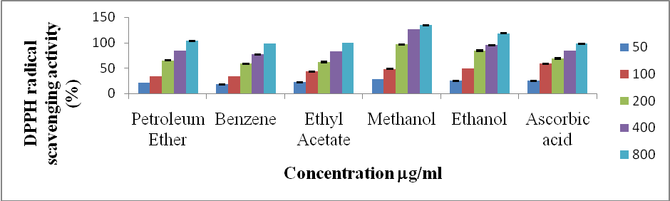 DPPH radical scavenging activity of petroleum ether, benzene, ethyl acetate, methanol and ethanol extracts of A. echioides the whole plant are shown in fig. 1. DPPH radical scavenging activity of five extracts was observed to be increased with the increase of dose (50-800mg/ml) were represented in the graph. Among the solvent treated, methanol extract exhibited highest DPPH radical scavenging activity. At 800mg/ml concentration, the methanol extract of A. echioides the whole plant possessed 134.15% scavenging activity on DPPH. The concentration of A. echioides whole plant methanol extract needed for 50 % inhibition (IC50) was 49.11 mg/ml, while ascorbic acid needed 32.18 mg/ml. (table 3).