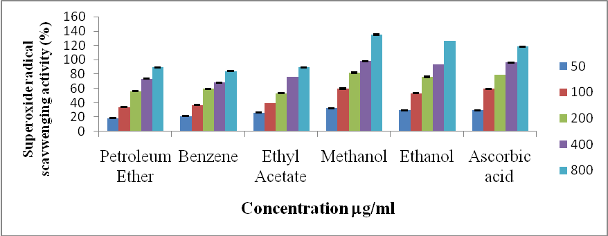 The different solvent extracts of A. echioides whole plant were subjected to superoxide radical scavenging activity, and the results were shown in fig. 3. It indicates that methanol extract of A. echioides whole plant (800 mg/ml) exhibited the maximum superoxide radical scavenging activity of 134.68 % which is higher than the standard ascorbic acid whose scavenging activity is 118.16 %. The IC50 value of methanol extract of A. echioides whole plant on superoxide radical was found to be 37.13 mg/ml and 30.16 mg/ml for ascorbic acid, respectively. (table 3).