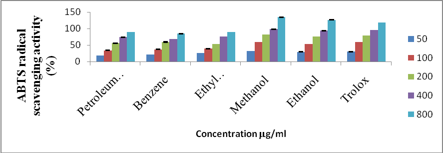 The different solvent extracts of A. echioides the whole plant were subjected to ABTS radical cation scavenging activity, and the result were shown in the fig 4. The methanol extract exhibited potent ABTS radical cation scavenging activity in a concentration-dependent manner. At 800 mg/ml concentration, 126.34 % scavenging activity on ABTS which was higher than the standard trolox whose scavenging activity was 102.16 %. The quantity of A. echioides methanol extract required to produce 50% inhibition of ABTS radical 38.15 mg/ml whereas 28.41 mg/ml (table 3) needed for trolox.