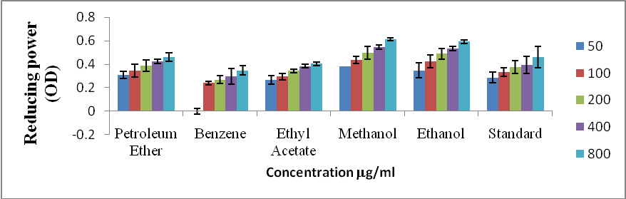 The reducing power of the extract was determined by the method of Kumar and Hemalatha [26]. 1.0 ml of solution containing 50,100,200,400 &800μg/ml of extract was mixed with sodium phosphate buffer (5.0 ml, 0.2 M, pH6.6) and potassium ferricyanide (5.0 ml, 1.0%). The mixture was incubated at 50 oC for 20 min. Then 5 ml of 10% trichloroacetic acid was added and centrifuged at 980 g (10 min at 5 oC) in a refrigerator centrifuge. The upper layer of the solution (5.0 ml) was diluted with 5.0 ml of distilled water and ferric chloride and absorbance read at 700 nm. The experiment was performed thrice, and results were averaged.