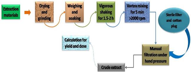 [EM, after drying (shed/sun) and grinding (size reduction), is shaken in a suitable solvent in the glass bottle (amber) and followed by vigorous shaking for up to 2 h. For more better mixing vortex at 2000-3000 rpm for 5 min is appreciated, which was then followed by manual filtration under hand pressure with CP and Whatman FP. Finally, solvent evaporation is recommended by using a Rotary evaporator under reduced pressure or simply at ambient temperature].