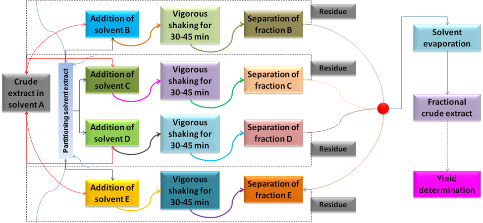 [The MVT extraction crude extract is now ready to be fractionated, where subsequently polarity-wise solvents are added to the original crude sample solution and shaken vigorously. To make sure of the two different solvent extracts a partitioning solvent is used. After elapsed time the partitioning solvent extract and fractional one are decanted out, leaving behind the original crude extract solution, which will undergo further one or more fractional separations.