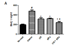 Fig. 1: Effects of CR, RSV and their combination on Body weight (A) and visceral WAT weight (B); Values are expressed as mean±SD (n=8), # significantly different from normal group at p<0.001, *significantly different from obese group at p<0.05, ª significantly different from calorie restricted group at p<0.05. CR, calorie restriction; RSV, resveratrol; WAT, White adipose tissue