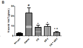 Methods: Rats received high-fat diet for four months to induce obesity. Animals which had ≥30 % increase in body weight were selected in this study. Obese rats were treated for 8 w with calorie restriction (25% food restriction of commercial chow) and/or resveratrol (30 mg/kg/day orally).