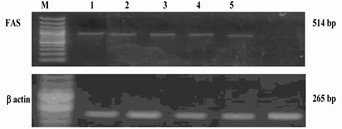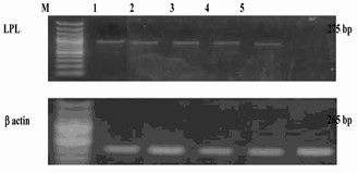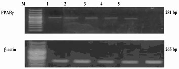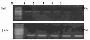 Total RNA was extracted from visceral white adipose tissue using the acid guanidinium thiocyanate–phenol–chloroform method. RNA concentration and purity were measured using a UV spectro-photometer, with A260/A280 ratios of 1.8 to 2.0 considered acceptable. Reverse transcription–polymerase chain reaction (RT-PCR) was performed using the extracted RNA for evaluation of PPARɣ, LPL, FAS, and Sirt1 gene expressions. β-actin expression level was used as a loading control for each sample. For amplification of target genes, RT-PCR was run as 2 separate steps. Briefly, equal amounts of total RNA were denatured thermally and reverse transcribed using the Moloney murine leukemia virus reverse transcriptase (Promega, Madison, Wisconsin), ribonuclease inhibitor (Promega), deoxynucleoside 50 triphosphate and oligo-dT primer. The reactions were terminated by heating to 95 ᵒC for 10 min, followed by cooling to 4 ᵒC. The complementary DNA samples were amplified in the presence of Taq DNA polymerase (Promega), deoxynucleoside 50 triphosphate, and the appropriate primer pairs (primers, annealing temperatures, and product sizes are listed in table 1). All PCR products were separated on 2% agarose gels, stained with ethidium bromide, and visualized using a UV transilluminator. Semi-quantification was performed using a gel documentation system (Biodoc analyzer) supplied by Biometra (Gottingen, Germany). The relative expression level of each studied gene (R) was calculated according to the following formula: R = Densitometric units of gene/Densitometric units of β-actin.