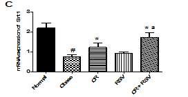By contrast to some publications that stated sirt1 activation as one mechanism by which resveratrol produces its beneficial effects on health[30-32], our results showed that resveratrol alone exert only weak non-significant increase in sirt1 expression, while upon combining with CR, a sirt1 activator, this group expressed a significant increase when compared with both obese and CR groups.