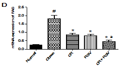 There was a significant decrease in visceral WAT PPARɣ, LPL, and Sirt1 messenger RNA (mRNA) expression with a concomitant increase of FAS mRNA expression in obese rats as compared to normal (P<0.001). Calorie restriction, RSV and their combination are induced a marked up regulation of PPARɣ and LPL genes and downregulation of FAS gene. However, CR and its combination with RSV showed significant up regulation for Sirt1 gene. In comparison to CR group, the combination demonstrated a marked up regulation of PPARɣ and Sirt1 genes and downregulation of FAS gene (fig. 2A, 2B,2C and 2D).