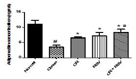 Fig. 3: Effects of CR, RSV and their combination on Adiponectin concentration. Values are expressed as mean±SD (n=6), # significantly different from the normal group at p<0.001, *significantly different from the obese group at p<0.05, ª significantly different from calorie restricted group at p<0.05. CR, calorie restriction; RSV, resveratrol