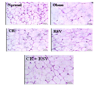 All strategies of treatment either dietary (CR) or therapeutic (Resveratrol) or combination showed an observed decrease in the size of adipocytes, relatively similar to that of normal rats.
