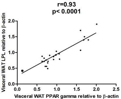 Fig. 5: Correlation between visceral WAT LPL gene expression and visceral WAT PPARg gene expression. WAT, white adipose tissue; PPAR gamma, Peroxisome proliferator-activated receptor gamma; LPL, Lipoprotein lipase