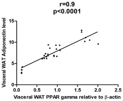 Fig. 6: Correlation between visceral WAT PPARg gene expression and visceral WAT adiponectin level. WAT, white adipose tissue; PPAR gamma, Peroxisome proliferator-activated receptor gamma