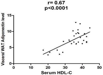 Fig. 7: Correlation between serum HDL-C and visceral WAT adiponectin level. WAT, white adipose tissue; HDL-c, high-density lipoprotein cholesterol