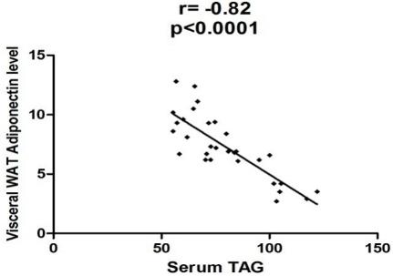 Fig. 8: Correlation between serum TAG and visceral WAT adiponectin level. WAT, white adipose tissue; TAG, triacylglycerol
