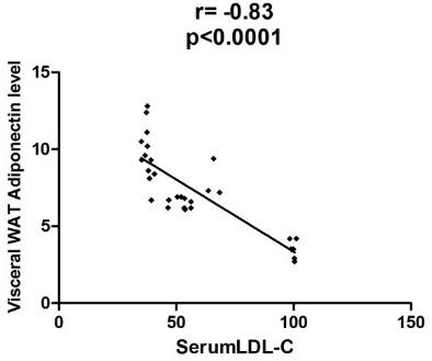Fig. 9: Correlation between serum LDL-C and visceral WAT adiponectin level. WAT, white adipose tissue; LDL-c, low-density lipoprotein cholesterol