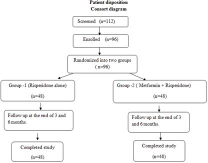 For a period of one year from March 2013 to February 2014, around 112 patients newly diagnosed with schizophrenia were initially screened. Based on the inclusion and exclusion criteria, around 96 patients were enrolled for the study. They were randomly assigned through the computer generated table into 2 groups receiving either Risperidone alone (or) Metformin along with Risperidone. All the patients completed the study, and the results were analyzed.