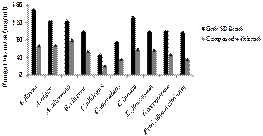 The growth inhibition effects of the compounds against the fungal pathogen were tested by supplementing 100 mg of the compounds in 100 ml of SD broth. After incubating the flasks for three days at 30 °C, the dry weight measurement of the fungal cells confirmed that the compounds significantly inhibited the growth when compared to the dry cell weight of the control fungal pathogens. Through analysis of the results indicated that the compounds revealed 62.2 % of the growth of Penicillium citrinum, whereas, F. oxysporum, C. lunata, C. maculans and A. flavus shared 53.46, 55.30, 52.63, 54.34 and 55.33 % of the growth inhibition (fig. 4). Among the fungi, E. floccosum, documented 43 % of biomass inhibition effect when the compound supplemented with the cultivation medium.