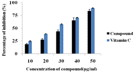 The antioxidant property of the isolated molecule was determined using DPPH method [17]. Briefly, freshly prepared DPPH solution in an ice cold methaol (0.15 %) was mixed with different concentrations of (10–50 µg/ml) of the compound under dark environment for 30 min, and the absorbance was read at 515 nm. The antioxidant activity was expressed as IC50 (µg/ml) (the antiradical dose required to cause a 50 % inhibition). Vitamin C was used as standard. The ability to scavenge the DPPH radical was calculated by the following formula: