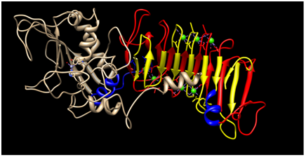 The C-terminal domain is a β strand-rich domain containing eighteen β strands, a short α-helix and seven Ca2+ions bound to calcium binding loops. It contains multiple tandem repeats of nine-residue motif including the pattern GCXGD, which forms a corks screw (fig. 3). This pattern is similar to haemolysin and hence thought to be important for secretion of the protein as well as for the folding and stability. Serratia protease has several bound calcium ions which are not essential for its catalytic function but are required for protection from autolysis [17].