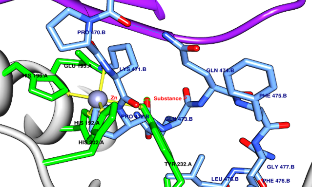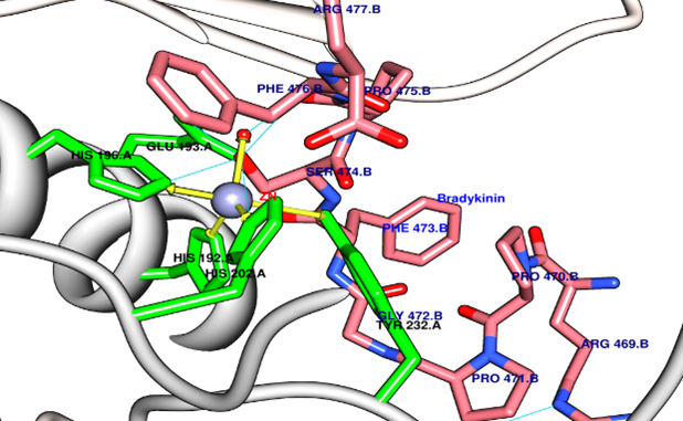 The other inorganic substances such as EDTA and Lisinopril were docked with Serrapeptidase enzyme using Swiss dock. The results of Swiss Dock showed full fitness and Gibbs free energy predicts docking interactions (table: 4). The EDTA showed full fitness of-1735.25 kcal/mol and estimated ΔG of-9.74 kcal/mol within active site amino acids His 192, His196, His202 of Serrapeptidase (fig: 7). The Lisinopril showed Full Fitness of-1830.91 kcal/mol and estimated ΔG of-10.50 kcal/mol within active site amino acids His192, His196, and His202 of Serrapeptidase (fig: 8). Inhibition of Serrapeptidase using EDTA and Lisinopril, the metal chelating agent helps in understanding that it is a metalloproteinase.