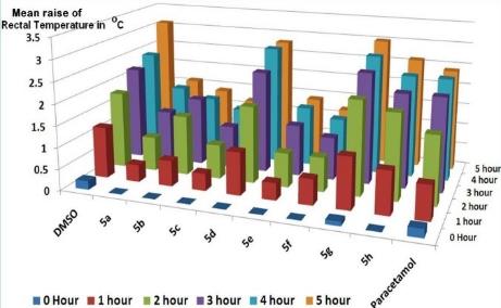 The tested rats exhibited a mean raise of about 1 °C in rectal temperature 1 h after Backer’s yeast injection (135 mg/kg, i. p). The test compounds (5dand 5h) produced significantly (p<0.05) antipyretic activity at 2, 3, 4 and 5 h, whereas test compound 5gand the reference drug Paracetamol (150 mg/kg) showed significant antipyretic activity throughout the observation period up to 5 h (fig. 1).