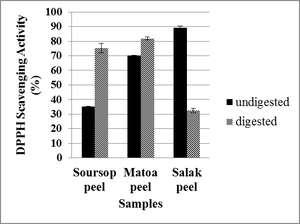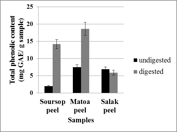 Total phenolic (TP) content in salak peel exhibited a significant decrease (p<0.05) after in vitro digestion with a value of 6.9 to 5.9 mg GAE/g sample (fig. 2). A similar resulted was found in papaya and araticum extracts that TP value in these samples was decreased after digested [26]. After in vitro digestion, matoa peel exhibited the highest value of TP (18.6 mg GAE/g sample) followed by soursop peel (2.0 mg GAE/g sample) and salak peel (6.9 mg GAE/g sample). The increasing of total phenolic after in vitro digestion could be caused by releasing of polyphenols and changing their structural form which has affected their chemical and functional properties [30]. We suspected that the matrix obtained from samples contained other substances that were not analyzed in this study, including non-phenolic substances involved in changed of antioxidant activity value after the in vitro digestion process. These compounds, such as amino acids, peptides, were released during digestion or were changed [26].