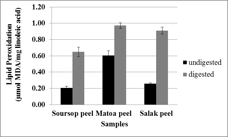 Fig. 2 presented that there was significant (p<0.05) difference between the undigested values and digested of tropical fruit peels in the DPPH radical scavenging activity, lipid peroxidation, total phenolic content. The soursop peel (35.0 to 75.3%) and matoa peel (70.2 to 81.8%) after in vitro digestion showed significant increased (p<0.05) in the DPPH radical scavenging activity, which was similar to what reported by [26] in the analysis of jackfruit. The pH and enzymatic interactions during digestion affected the result of antioxidant activity [26].