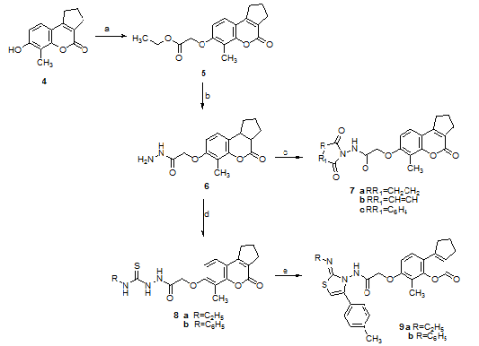 The general methods for the synthesis of target compounds 7a-c-9a,b, and 12a,b are depicted in Schemes 1-2. The key intermediate 6 was synthesized from 3, 4-cyclopentene-7-hydroxy-8-methyl-2H-1-benzopyran-2-one 4 through etherification with ethyl chloroacetate to give the ether derivative5, followed by hydrazinolysis.