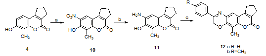 The typical method for nitration of 3, 4-cyclopentene-7-hydroxy-8-methyl-2H-1-benzopyran-2-one 4 involves the use of nitric acid and sulfuric acid, so-called ''mixed acid''. Sulfuric acid acts as a catalyst as well as an absorbent for water. 6-Nitrobenzopyran-2-one 10 was reduced to the corresponding amino compound 11 using sodium dithionite in ammonia for 15 min. Pyranobenzoxazin-8-one derivatives 12a,b were synthesized in good yield by reaction of the amino compound 11 with the appropriate phenacyl bromide derivatives in the presence of absolute ethanol and sodium ethoxide. Both the analytical and spectral data (IR, 1H-NMR, MS) of all the newly synthesized compounds were in full agreement with the proposed structures.