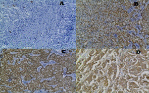 Fig. 1: Microscopic images of the pattern of IHC×100 staining in breast carcinoma. (A) Negative expression of receptors (ER, PR & Her2/neu) (B) Nuclear stain of ER (C) Nuclear stain of PR (D) Cytoplasmic stains of Her2/neu