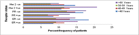 Breast carcinoma patients were categorized in different age groups from less than 40 y to greater than 60 y. The mean age was 48 y. No statistically significant association was found in positive/negative expressions of ER, PR and Her2/neu and different age groups. The positive expression of ER, PR and Her2/neu found higher in old patients whereas negative expression of ER and Her2/neu found higher in patients younger patients. However negative expression of PR found both in old and young patients (fig. 2).