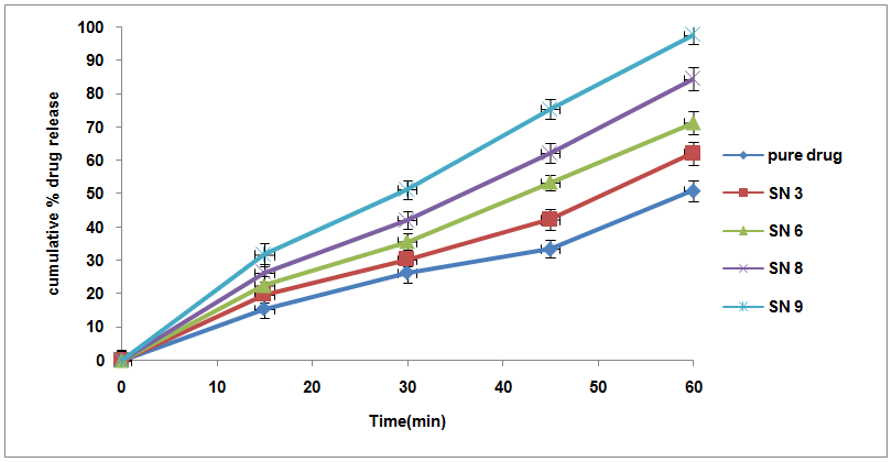 Since globule size is one of the prime factors which significantly contribute to the absorption of the drug, the globule size and size distribution after self-emulsification is an important parameter that has to be evaluated. Of formulations from SN3 to SN9, globule size was significantly decreased (table 7). This resulted because of the concentration of surfactant increased, and that of oil decreased from SN3 to SN9. High surfactant levels enabled rapid dispersion of globules in SGF. A surfactant having hydrophilic nature (high HLB) assists information of O/W emulsion rapidly spreading in an aqueous medium. Surfactants are amphiphilic in nature & they can dissolve or soluble relatively high amount of hydrophobic drug compound. This can prevent precipitations of the drug within the GI lumen & for prolong the existence of drug molecules. Since droplet surface area is inversely proportional to diameter, smaller lipid droplets with their associated, greater surface area are thought to facilitate digestion, resulting in more lipid and uniform drug release and absorption [30].