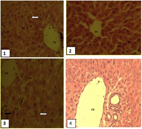 Fig. 1: Photomicrograph of liver sections of mice from experimental groups 1 and 3 showing mild areas of hepatocyte degeneration/vacuolation (white arrows) and inflammatory cell infiltrates (black arrows); that of groups 2 and 4 are apparently normal. Note the central vein (CV). H and E x 400