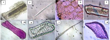 Fig. 1: Photographs of powder microscopic of Panchasakara churna. (a) Starch grains of Shunti, (b) Fragmented vessel elements of Shunti, (c) Oil globule of Shunti, (d) Fibre of Shunti, (e)Trichomes of Swarnapatri,(f) Epidermis, surface view of Swarnapatri, (g) Crystal fiber of Swarnapatri, (h) Water tubes of Swarnapatri, (i) Elements from the fibro- vascular tissue of Saunf,(j) Simple Fibre of Saunf, (k) Epicarp in surface view of Saunf, (l) Vittae of Saunf, (m) Pitted Sclereids of Haritaki, (n) Sclereids with wide lumen of Haritaki, (o) Needle shape Fibre of Haritaki, (p) Stone cell of Haritaki, (q) Starch grain of Haritaki.