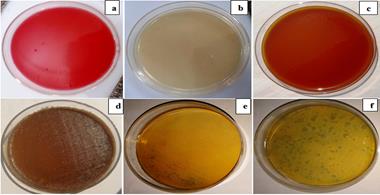 Fig. 2: Photographs of Microbiological limit test in Panchasakara churna. (a) Escherichia coli, (b) Pseudomonas aeruginosa, (c) Salmonella ebony, (d) Staphylococcus aureus, (e) Total Fungal Count, (f) Total bacterial count