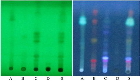 The developed TLC plates were examined under ultraviolet light at 254 nm and 366 nm [19]. The Rf values of the resolved spots were noted.