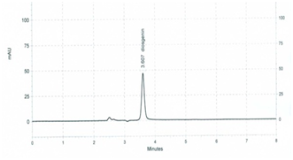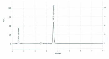 High-performance thin layer chromatography (HPTLC) of the extract indicated the presence of triterpenoid saponin. High-performance liquid chromatogram of the extract yielded two peak signals at 2.5 and 3.0 min respectively against the Standard diosgenin at 3.5 min (fig. 1). The second component which corresponds to the standard signal (at 3.5 min) was eluted out and collected.