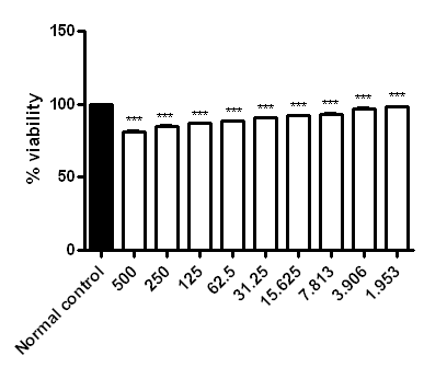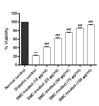 Fig. 2: Cytotoxicity assessment of SMC by MTT assay. Values are expressed as mean±SEM (n=6). *** p<0.001 compared with the normal control
