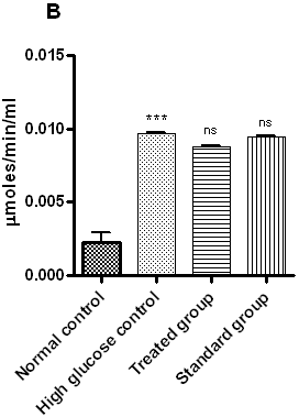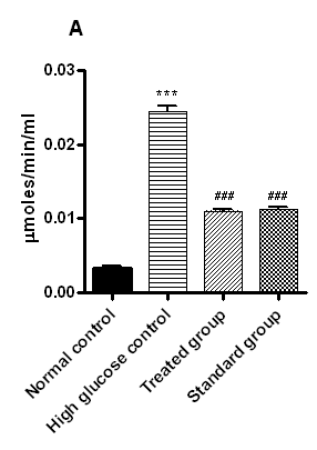 Saponin of Momordica cymbalaria has also been found to significantly reduced the formation of sorbitol (p<0.001) under hyperglycemic state when compared to high glucose control group. The activity has been found to comparable to that of the standard drug epalrestat. However, sorbitol remained undetected in the normal control group without glucose (fig. 5).
