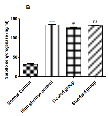 Fig. 4: Effect of SMC of aldose reductase (A) and sorbitol dehydrogenase (B) activities. Values are expressed as mean±SEM (n=6). *** p<0.001 compared with the normal control; ### p<0.001 compared with the high glucose control, ns = statistically not significant when compared with high glucose control