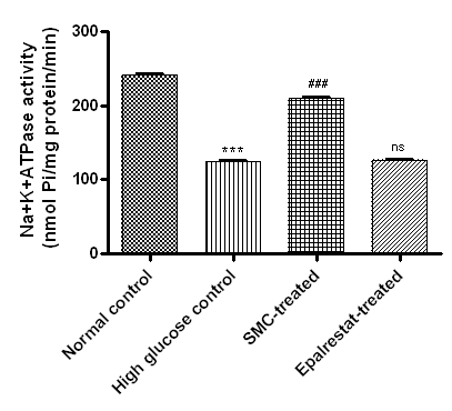 Fig. 7: Effect of SMC on Na+K+-ATPase activity in NB-41A3 cells maintained in high glucose (56 mM). Values are expressed as mean±SEM (n=6). *** p<0.001 compared with the normal control; ### p<0.001 compared with the high glucose control, ns = statistically not significant when compared with high glucose control