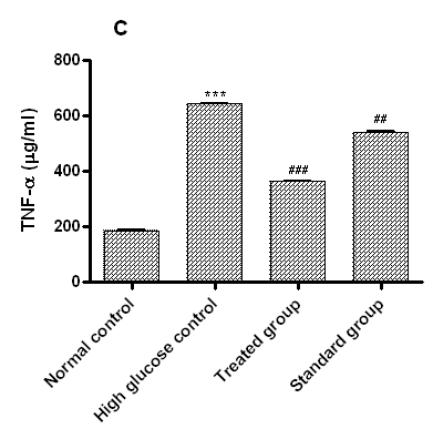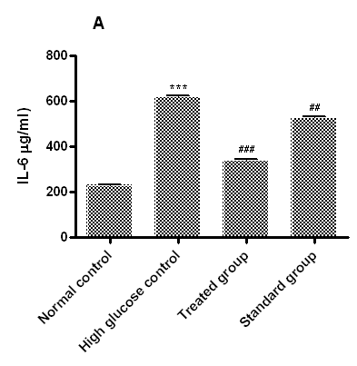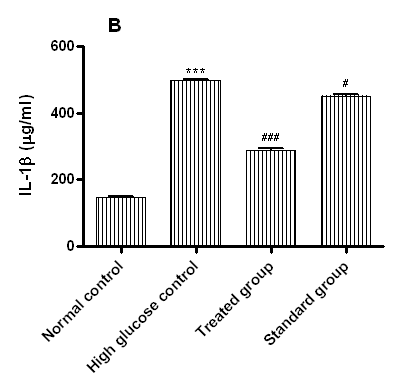 Assessment of the anti-inflammatory activity of SMC was done on NB-41A3 cells maintained in high glucose (56 mM) environment. It was found that the production of all three pro-inflammatory cytokines viz., IL-6, IL-1β and TNF-α was increased considerably by the cells in high glucose as compared to those in a normoglycemic (5.5 mM) state. However, treatment with SMC has significantly suppressed the production of the cytokines as compared to the high glucose control (p<0.001) and the standard, epalrestat (fig. 8).