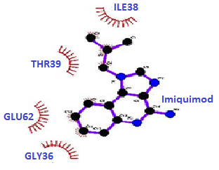 Fig. 2: (a) Docking image of Imiquimod bound to IL1R1-IL1Ra_SNP complex. (b) Non-bonded interactions between IL1R1 and Imiquimod