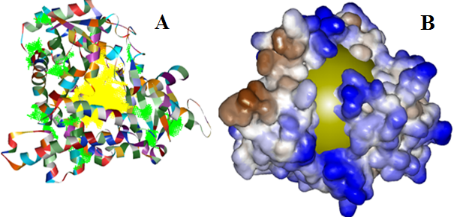 Insilico binding site prediction is one of the important tasks in bioinformatics to carry to docking studies. Leis et al., 2010 describes that prediction of the accurate binding site on the protein surface plays an important role for rational based drug design process with relevance to medical applications. He states that many cavities or binding site prediction tools are developed rapidly to find the exact surface of the protein-binding site [19]. In this study, the binding site of the protein is predicted based on erase and flood filling algorithm. There are totally 14 sites has been predicted on the by flood filling algorithm available in acclerys discovery studio 2.0v software in a tool for binding site prediction. Fig. 3 shows the binding site of the drug target protein. In the fig. 3: A yellow color shows largest binding site whereas other binding sites is shown in green color. Fig. 3: B shows hydrophobic surface of the protein with yellow color in the middle as binding site of the protein.