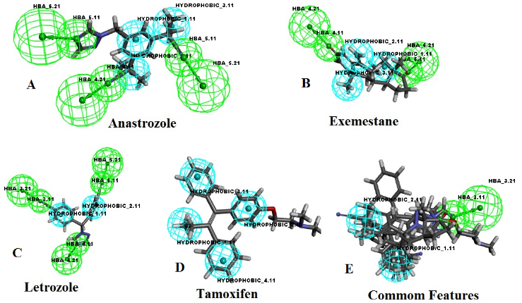 Fig. 4 shows the individual pharmacophore features of the drugs. Commonly green color indicates hydrogen bond acceptor (HBA) and cyan color indicates hydrophobic region.4A: shows the six pharmacophore feature of the drug anastrozole, among them three are HBA and another three features are hydrophobic. In fig. 4B: exemestane shows five different features, where three of them are hydrophobic and two are acceptors. Similarly, fig. 4C & D shows letrozole with five pharmacophore features with three acceptors, two hydrophobic, and tamoxifen with four hydrophobic features respectively. Whereas, the common features of the four drugs show two hydrophobic features and one acceptor.