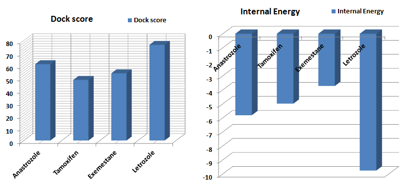 Conclusion:Among the four drugs, letrozole shows more dock score of 76.566kcal/mol with internal energy of-9.759. On the other hand, tamoxifen shows least dock score of 48.494 kcal/mol having internal energy of-4.987. Thus, the docking study reveals that aromatase inhibitors drugs are more effective than tamoxifen for treating postmenopausal in women.