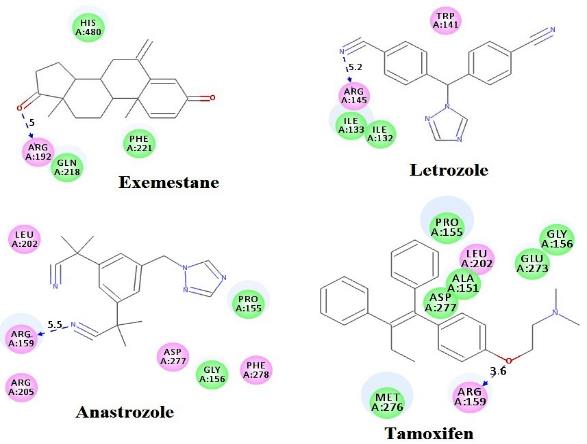 Results:The results show that all the drugs are more favorable to bind with arginine (Arg) amino acid present in the active site of the protein. Letrozole shows good binding affinity with the active site of the protein.