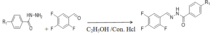 To the ethanolic solution of benzo hydrazide (0.1 mol), 2,4,5-trifluorobenzaldehyde (0.1 mol) and few drops of con HCl were added. The reaction mixture was stirred well at room temperature for 30 min. Insoluble solid gradually generated was filtered and washed with petroleum ether(40-60%) and dried in vacuum desicator. The crude solid was recrystallised from absolute ethanol. Similar reaction and purification procedures were applied to prepare all the compounds.