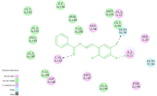 | B1 | Electrostatic | 2 | (1) Between–C=O-of benzo hydrazide and of amino acid residue LYS A: 165 (2) Between fluorine of aldehyde and of amino acid residue ILE A: 21 |