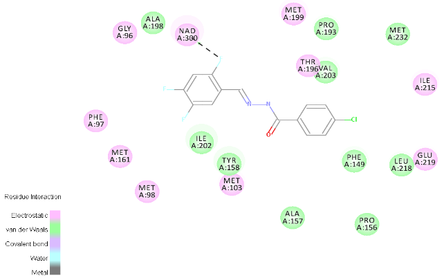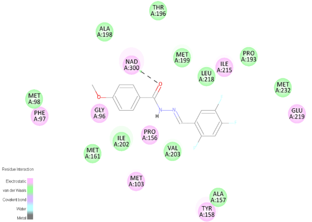 | P1 | Electrostatic | 1 | Between–C=O-of benzo hydrazide and NAD 300 of amino acid residue |