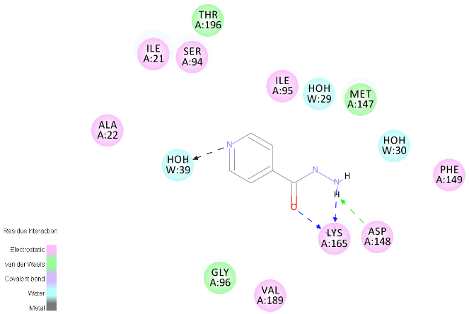 | Isoniazid | Electrostatic | 2 | (1) Between–C=O-of benzo hydrazide and and of amino acid residue LYS A: 165 (2) Between hydrogen of benzohdrazide and LYS A: 165 of amino acid residue |